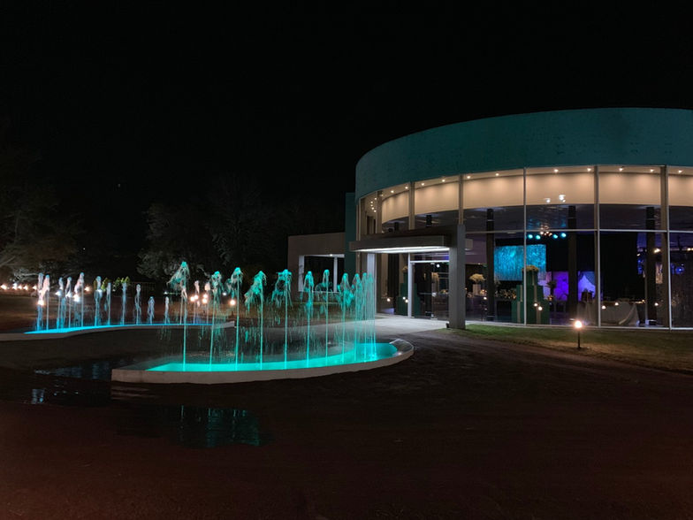 La entrada al Salón está flanqueada por dos fuentes con iluminación led que completan un lugar único para disfrutar todos los meses del año. El edificio cuenta además con una terraza techada de 200 m2. El complejo posee un doble ingreso (clientes y proveedores), 500 metros de caminos señalizados y estacionamiento propio para más de 200 autos.